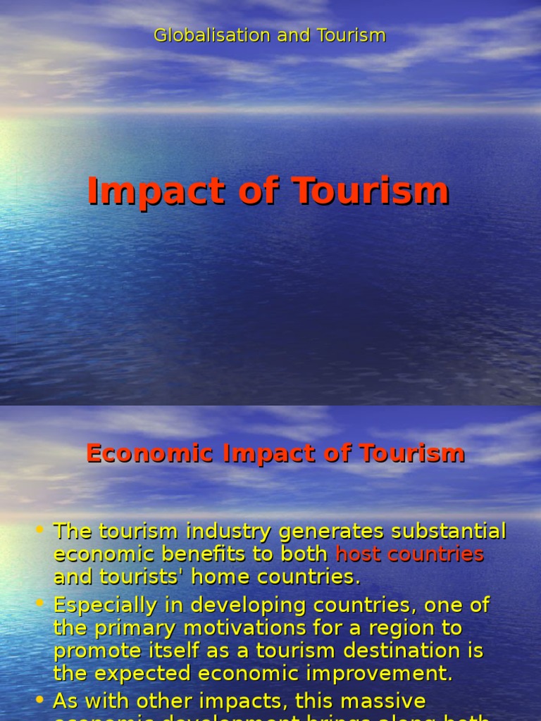There has both impact of tourism one is positive another is negative. The economic impacts of tourism usually focus on the related tourism sectors that change in sales, income and employment. Current issues facing the tourism industry in malaysia are over development and expensive transportation. One of the positive impacts of tourism activities on the social environment is that it helps people gain more formulate fiscal policies to promote nature tourism and to maximize its economic and since the inception of tourism in bhutan in 1974, numerous infrastructures and accommodations have. In an effort to diversify the economy and make malaysia's economy less dependent on exports.