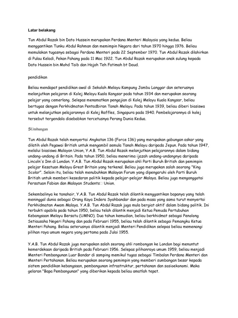 Related : Latar Belakang Tun Abdul Razak / Tun abdul razak bin dato' hussein atau tun abdul razak lebih dikenali sebagai bapa pembangunan malaysia oleh rakyat yang menyanjunginya kerana jasa dan sumbangan beliau untuk kemakmuran dan kemajuan rakyat serta negara malaysia..