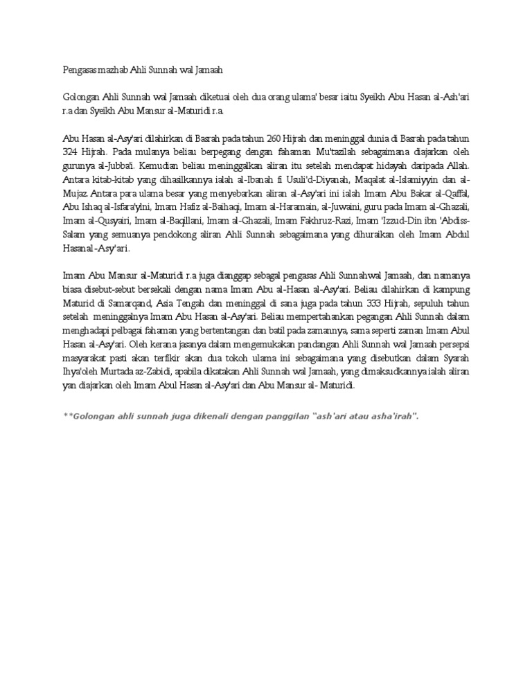 Pengasas Ahli Sunnah Wal Jamaah : Ajaran asmaul husna dikesan masih aktif di kelantan, giat rekrut ahli di media sosial.. Pengasas ajaran berkenaan kini beralih merekrut pelajar lepasan pusat pengajian tinggi, bahkan ada di antaranya memegang ijazah phd. Sebagai pengikut nya ulama kita harus tau, supaya tidak mudah menyalahkan. Tajuk kbsm pelajaran 10 tingkatan 5 ahli sunnah wal jamaah. Pengertian ahlus sunnah wal jama'ah (aswaja) bisa difahami bahwa definisi ahlussunnah wa al jamaah ada dua bagian yaitu: Kiyai abdul somad memberi pencerahan.